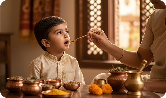 Swarna Bindu Prasana helps to give your child the gift of health, naturally! It is an Ayurvedic practice of administering medicinal drops to children, on an empty stomach, ideally during auspicious days like Pushya Nakshatra, for ages up to 12 years. The practice is likely to strengthen child’s immunity, improve memory, and support healthy growth.