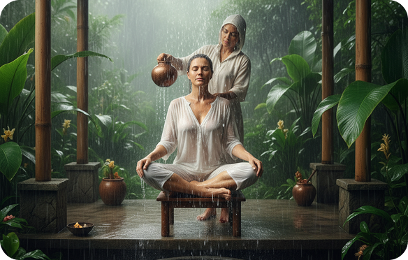 Shiro (head) dhara (flow or stream) involves a continuous but gentle pouring of warm, medicated oil or other therapeutic liquids onto the forehead, specifically in the third-eye area. This treatment calms the nervous system, reduces stress, balances doshas, induces a meditative state (relieving mental tension, anxiety, headaches, and insomnia), stimulates pituitary gland (to regulate bodily functions related to stress and emotions.
