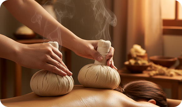 Udwarthanam (Urdhwa – upward; Vartham – move) involves vigorous, deep tissue massage, done upwards, using hearbal powders, sometimes combined with medicated oils or ghee. It stimulates blood circulation, promotes lymphatic drainage, exfoliates dead skin cells, and improves skin texture and tone, reduces weight, helps alleviate arthritis. It can also address metabolic issues such as diabetes and high cholesterol.